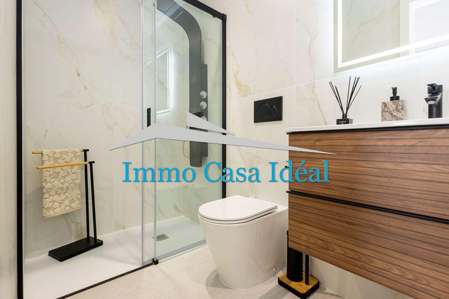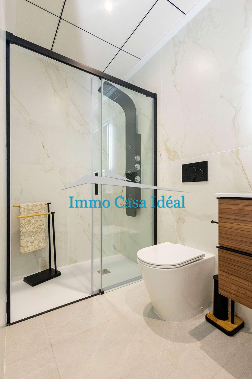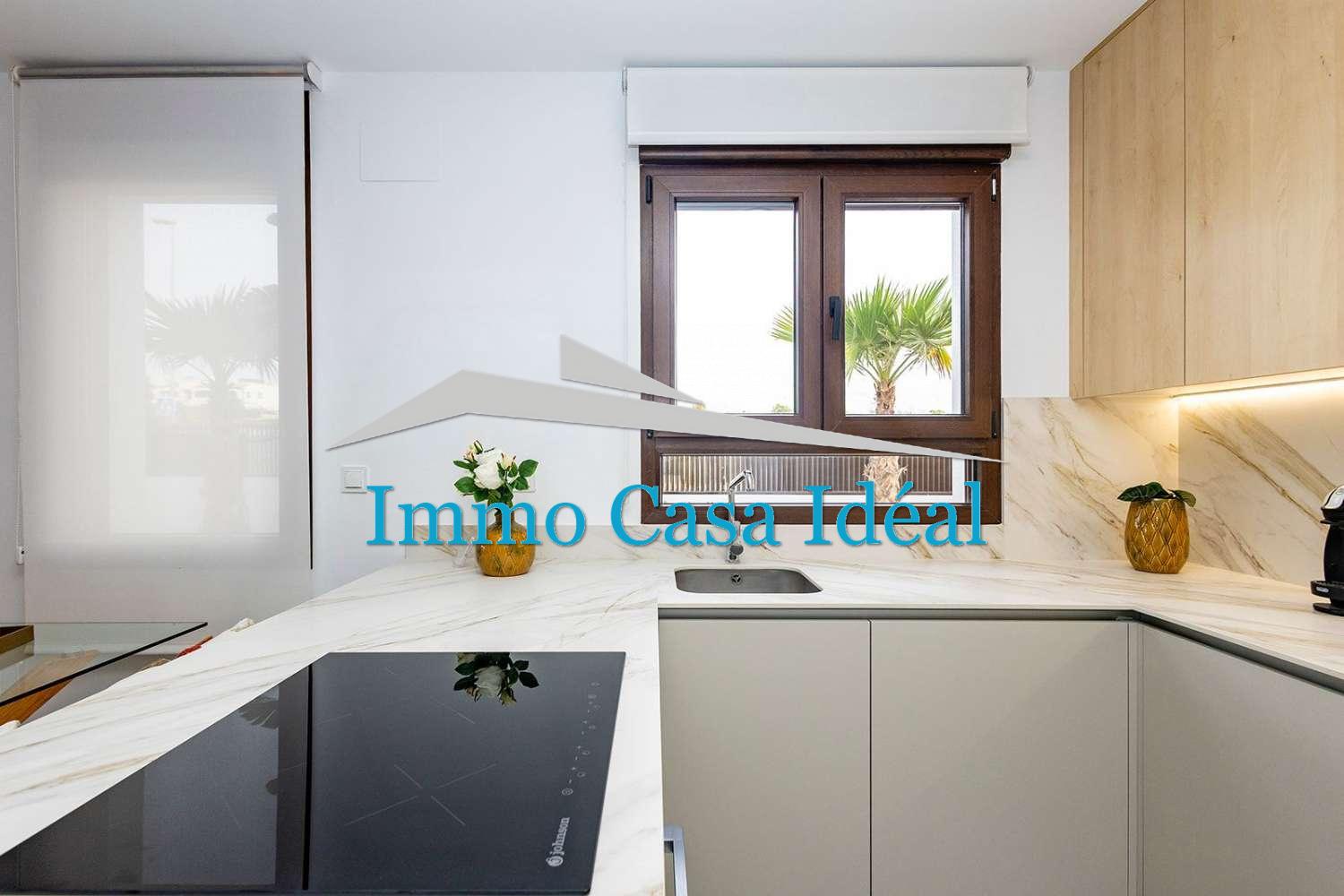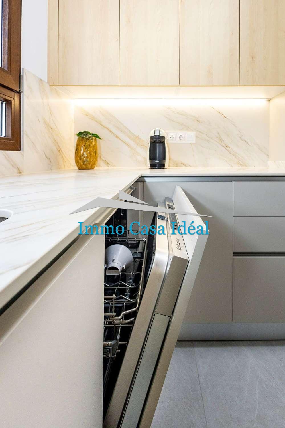 Terraza con porche cubierto, amplio salón-comedor y cocina de planta abierta, 2 dormitorios con armarios empotrados y 2 baños completos (uno en suite).