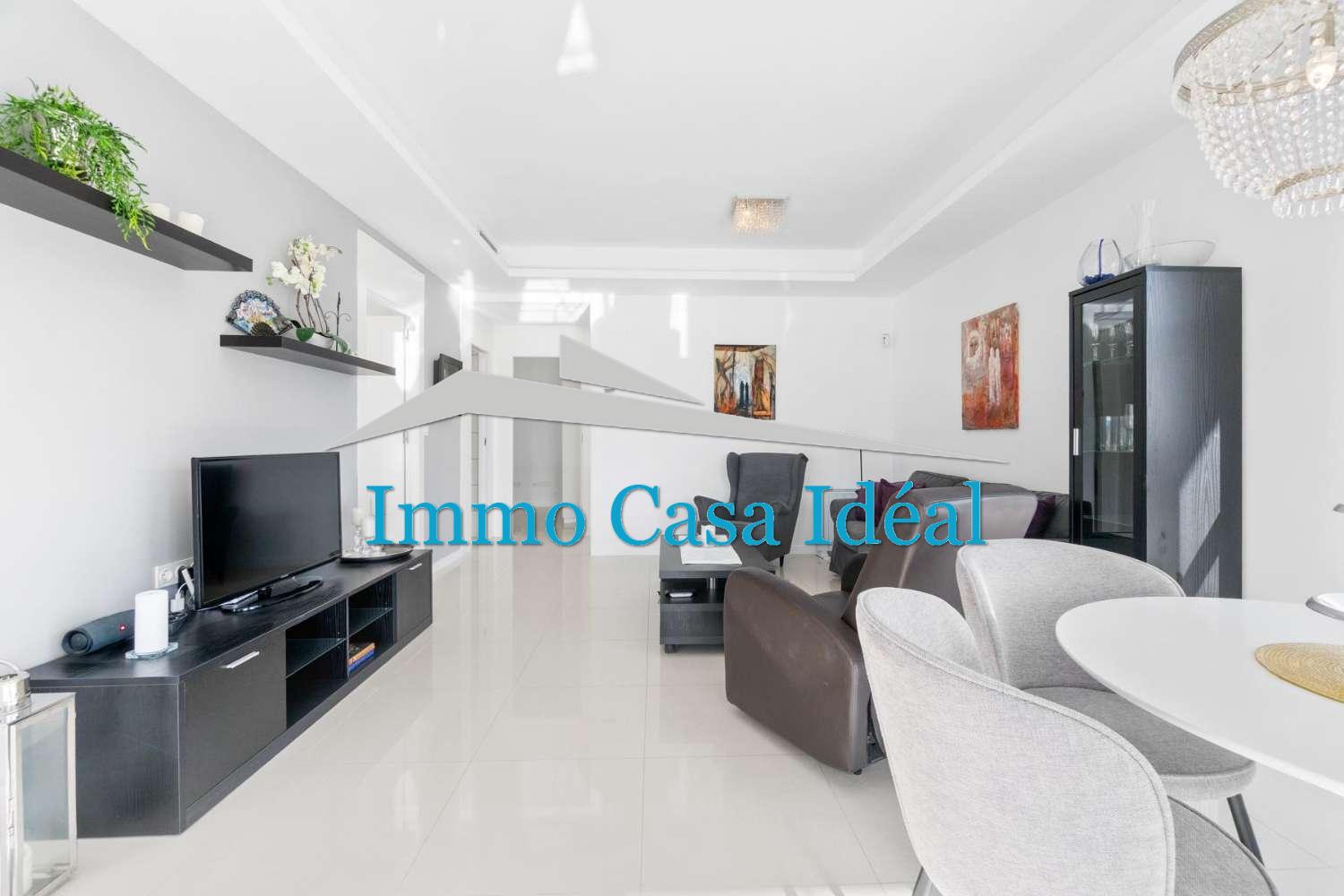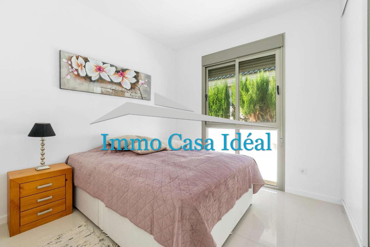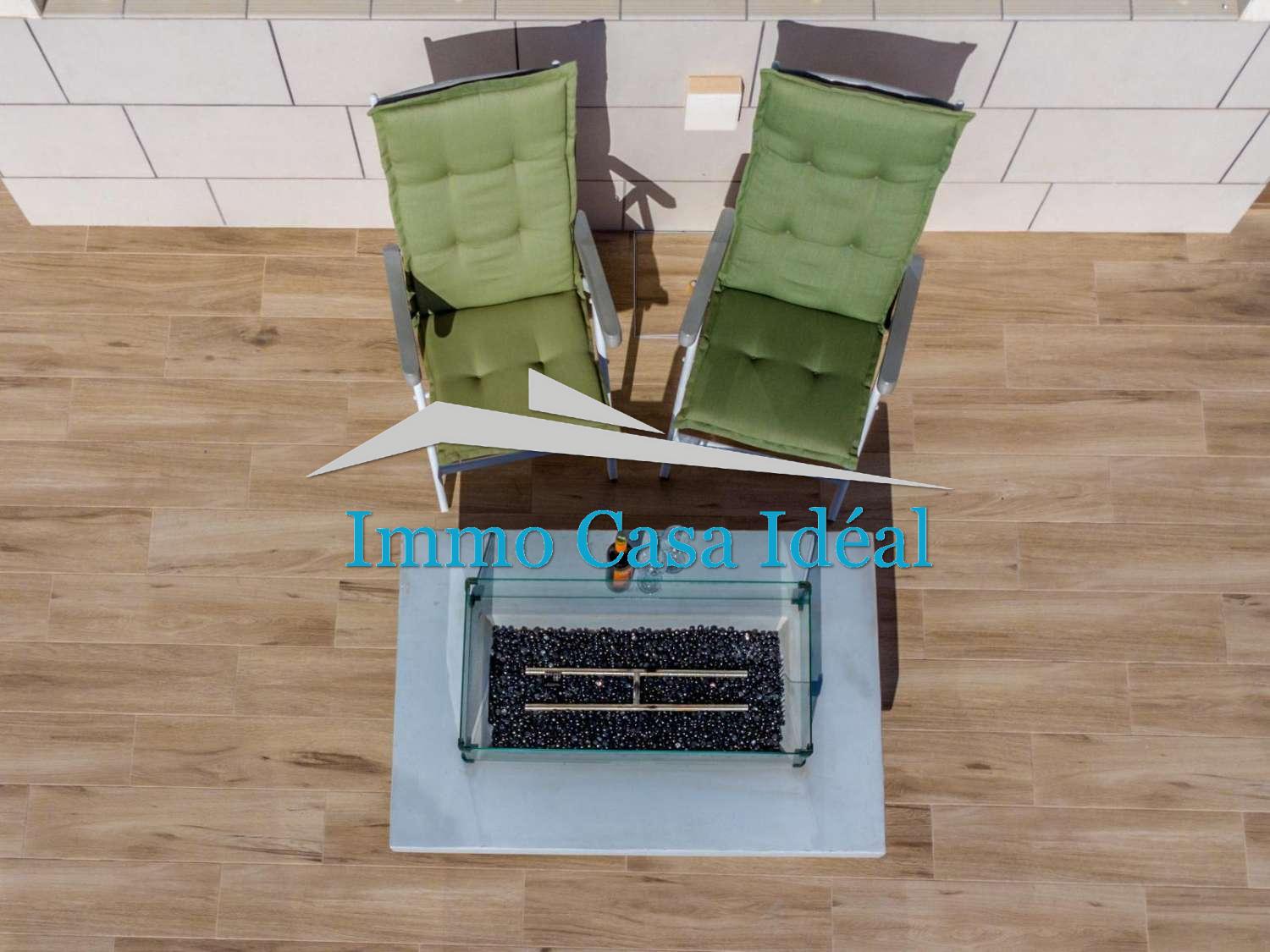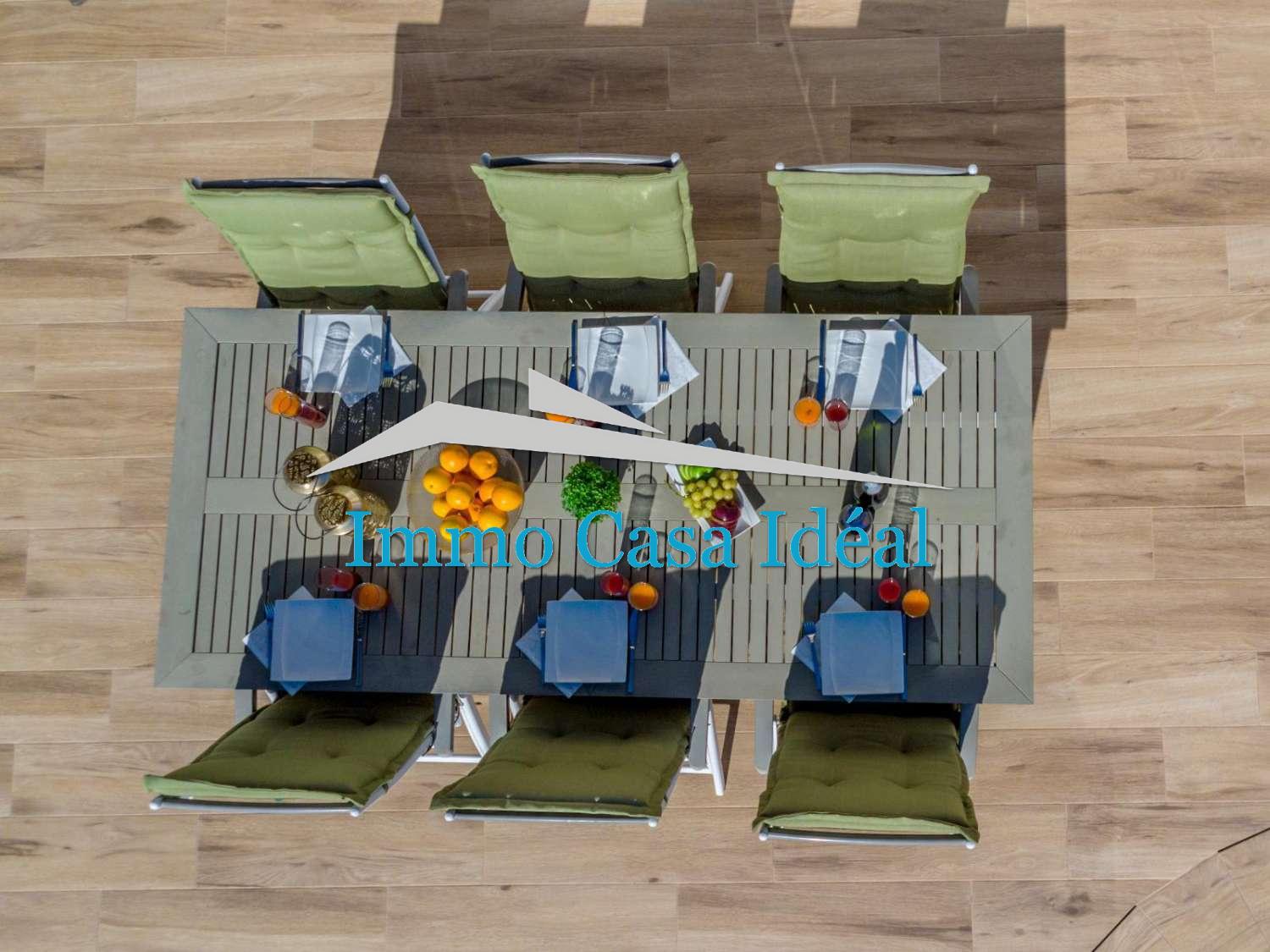 À l’intérieur, une terrasse vitrée avec panneaux repliables mène à un vaste salon-salle à manger avec cuisine ouverte entièrement équipée. Tout est sur un seul niveau : trois chambres, dont une avec salle de bain en suite, plus une salle de bain pour les invités. La maison est vendue entièrement meublée et en état impeccable, prête à emménager. Son orientation sud garantit une luminosité naturelle toute la journée.