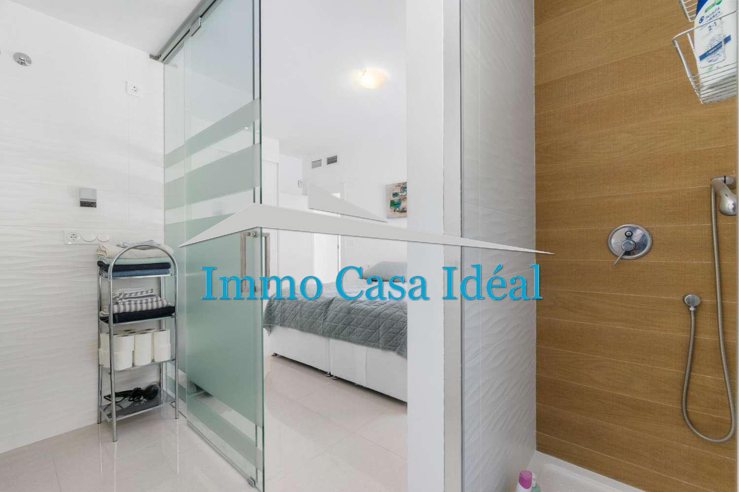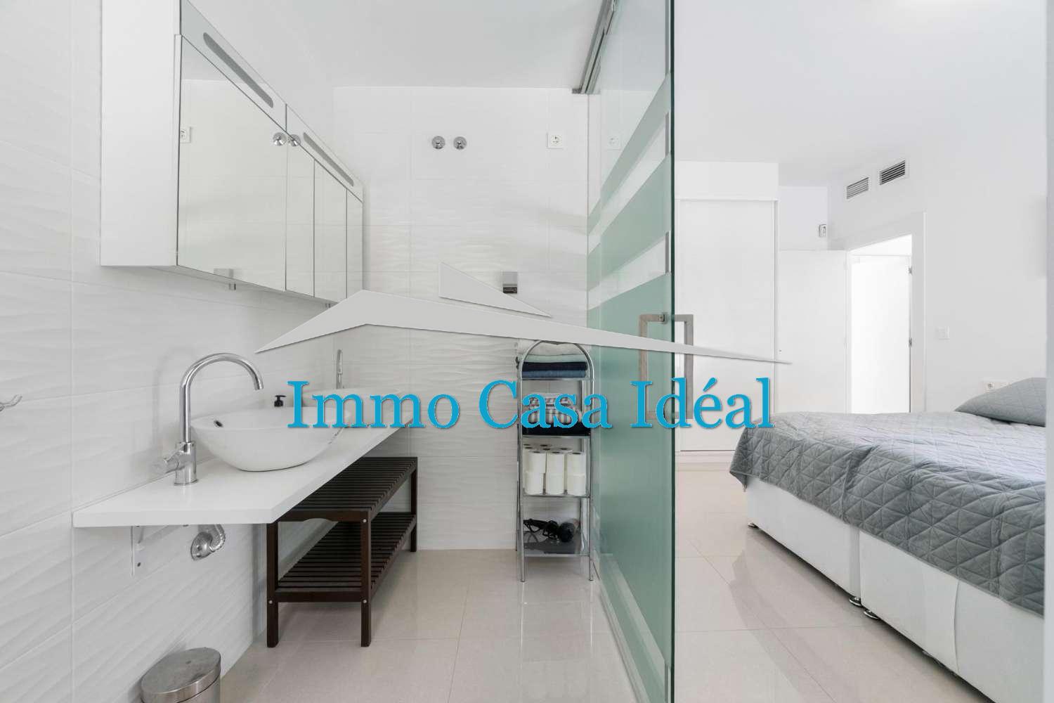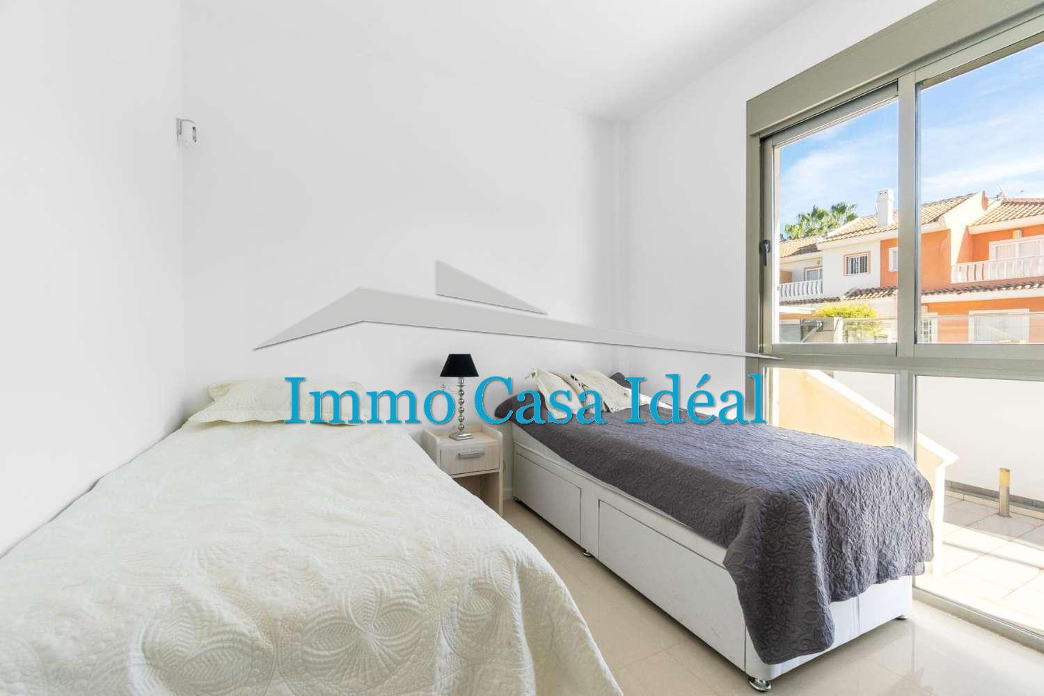 À l’intérieur, une terrasse vitrée avec panneaux repliables mène à un vaste salon-salle à manger avec cuisine ouverte entièrement équipée. Tout est sur un seul niveau : trois chambres, dont une avec salle de bain en suite, plus une salle de bain pour les invités. La maison est vendue entièrement meublée et en état impeccable, prête à emménager. Son orientation sud garantit une luminosité naturelle toute la journée.