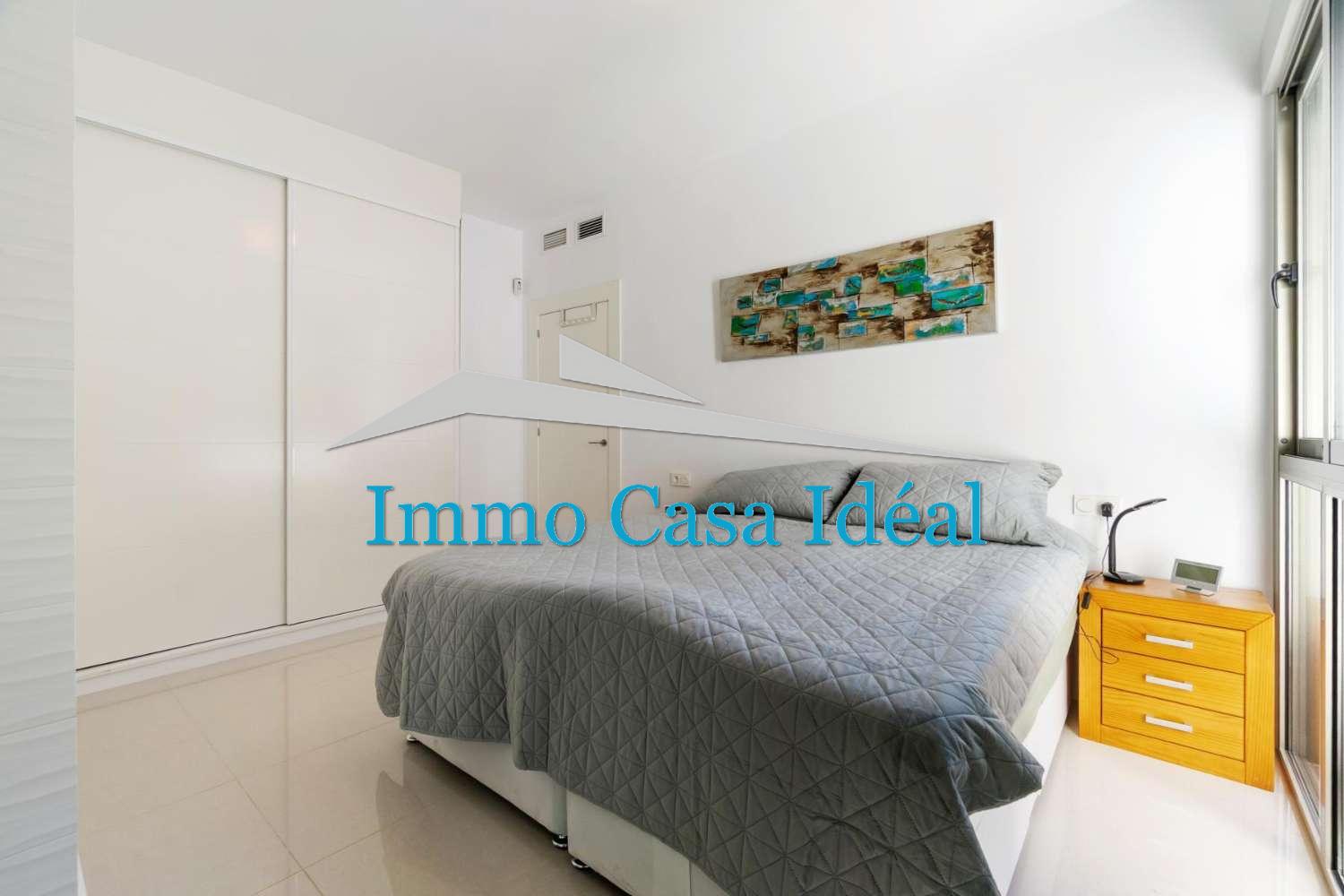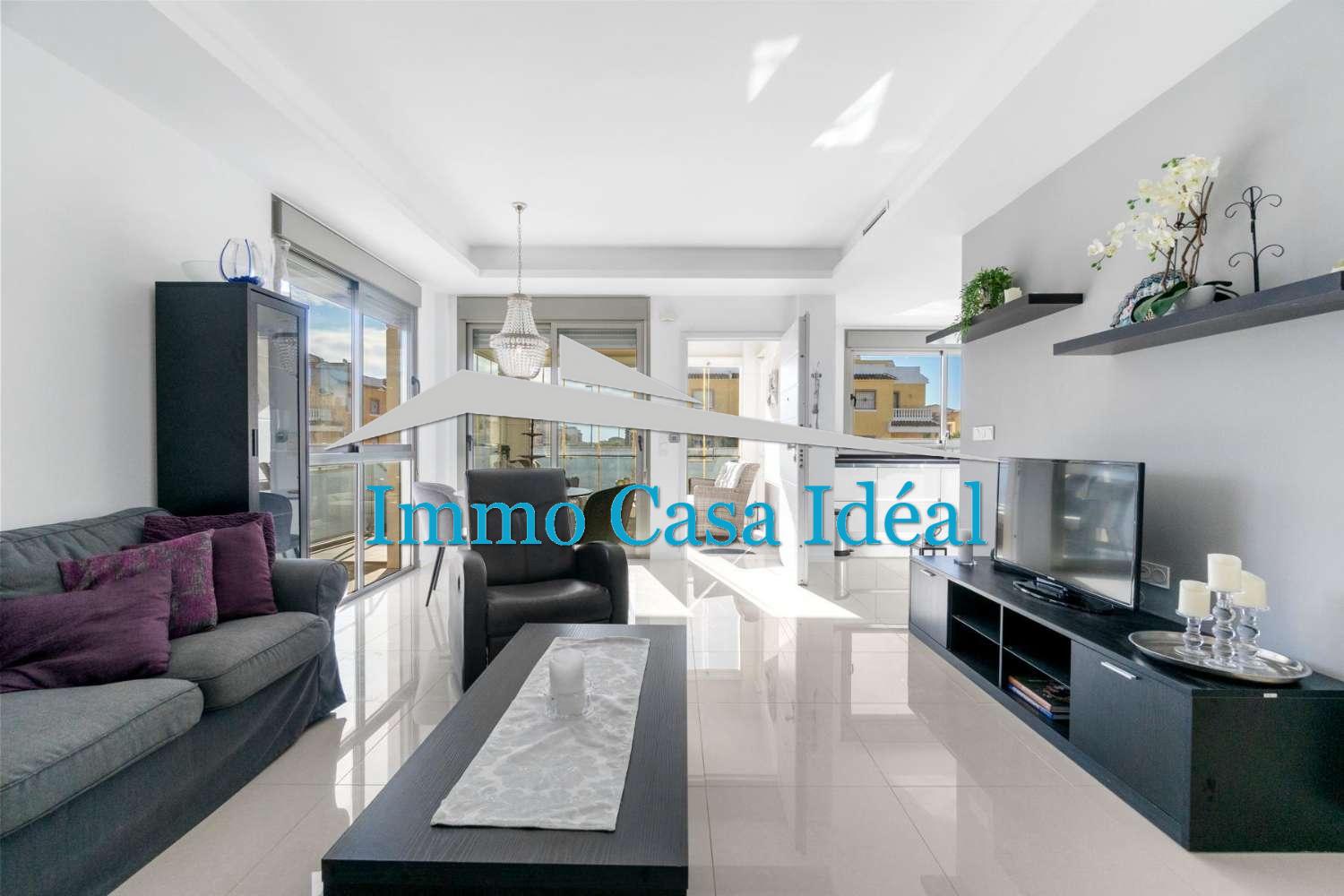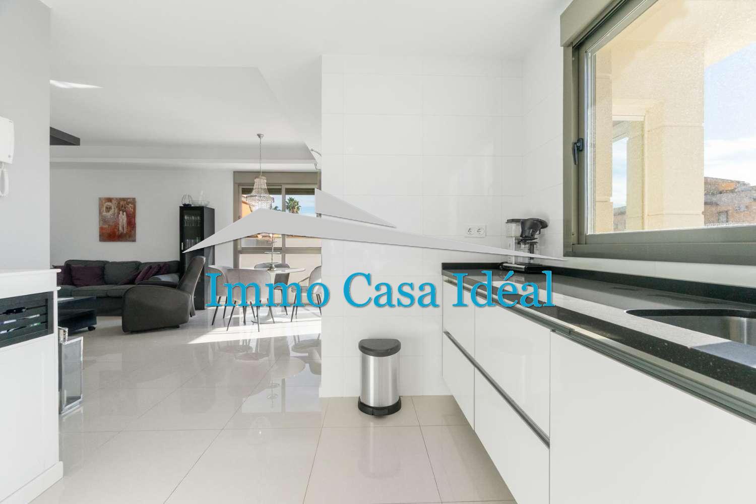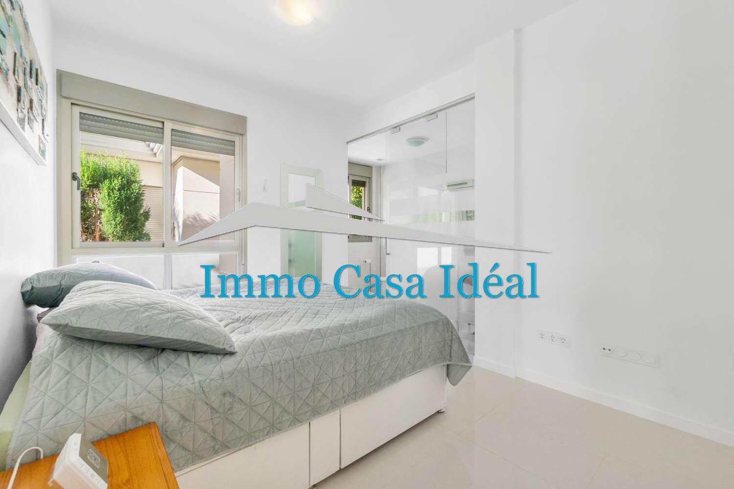 À l’intérieur, une terrasse vitrée avec panneaux repliables mène à un vaste salon-salle à manger avec cuisine ouverte entièrement équipée. Tout est sur un seul niveau : trois chambres, dont une avec salle de bain en suite, plus une salle de bain pour les invités. La maison est vendue entièrement meublée et en état impeccable, prête à emménager. Son orientation sud garantit une luminosité naturelle toute la journée.